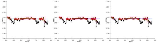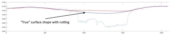 The model fitting method estimates the reference surface on a profile-by-profile basis. The method uses a raw range image, without rectification, and relies on a robust method like Random Sample Consensus (RANSAC) to fit transverse profiles with polynomials with different orders. As shown in Figure 23, the model fitting method uses a combination of first-order and third-order polynomials to segment surface points (red points) to estimate the reference surface.