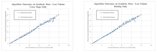 Validation outcomes of aggregate loss volume. Left: Synthetic pavement images with no rutting. Right: Synthetic pavement images with rutting.
