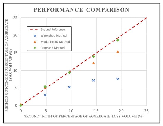 Using the range images obtained from a simulated pavement mat, the results from both methods are shown in Figure 24. Compared to the proposed method, the watershed method performed poorly; it consistently underestimated the aggregate loss volume. The proposed method and the model fitting method performed comparably until there was an aggregate volume loss of 10%; the accuracy started to drop for the model fitting method after 10%, as the results underestimate the aggregate loss volume. Overall, this shows the proposed method outperformed both other methods in aggregate loss quantification.