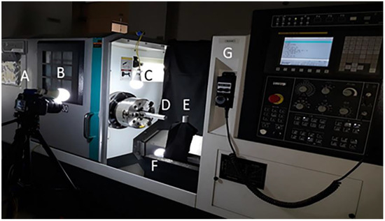 In Figure 2, an experimental setup in which “A” is the camera, “B” is light source 1, “C” is the light source 2, “D” is the workpiece, “E” is the calibrated object, “F” is light source 3, and “G” is the CNC machine is shown. The complete details of the equipment used are shown in Table 2.