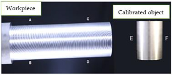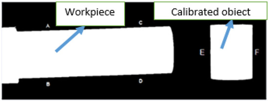 A cylindrical-shaped workpiece with a diameter of 37.48 mm is selected for the experimental trials. The turning operation reduced the thickness of the workpiece by up to 4 mm. Based on the given data, after one complete machining operation, the measured diameter at different points of the workpiece is found in the range of 33.43 mm to 33.53 mm. The average value of 33.48 mm is taken and set as actual value for real-time metrology operation. The system measures the diameter of the workpiece from points A, B to C, D using reference values from points E and F of the calibrated object in the binary image, as shown in Figure 6. The calibrated object’s reading is taken very precisely because the output is based on the reference object. As the values are measured with the reference calibrate object, so the system achieves accuracy at the submillimeter level at thousands of points of the workpiece. The deviation is calculated using the following equation: