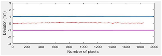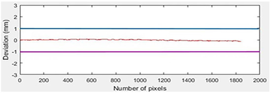 Twenty-seven experiments were performed as stated in the DOE using the defined parameters. Figure 7, Figure 8 and Figure 9 show three results, out of twenty-seven experiments, in which the distance between the camera and the workpiece was set to its maximum value, i.e., 45 cm, against the different lightning and rpm values. The graph is established between the deviation values against the number of pixels for each experiment respectively. Total of 1800 observations are studied. It is observed that each measured value lies close to the reference value of 33.48 mm at all points against the specific pixel. The variation in the graph shows that the error generated either falls closer to zero or produces (positive and negative) deviation around the reference value zero. It can be observed that in experiment 21, 48%, 42%, and 9% of readings show zero, greater than zero, and less than zero error, respectively, illustrated in Figure 7. In experiment 24, 10%, 35%, and 53% of readings show zero, greater than zero, and less than zero error, respectively. Figure 8 shows an example of this. Similarly, in experiment 25, the values are distributed as follows: 10% of the measured values show zero error, 24% show negative error, and 64% show positive error. Figure 9 depicts this.