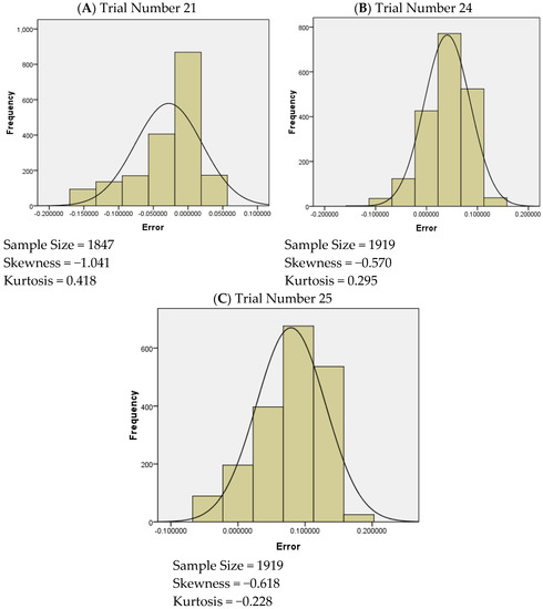 Percentiles are important measures of location. Table 4 shows the values of the selected percentiles from P05 to P95. Together, these percentiles give an idea about the distribution of the data around a central location (i.e., 33.48 for diameter and 0.00 for error). The median (P50) value of E 21 j is 0.00 mm; the same value for E 24 j is 0.05 mm, whereas the same value for E 25 j is 0.09 mm. This shows that compared to E 21 j , both E 24 j and E 25 j are slightly upward-biased. However, the amount of bias (about 0.27%) is negligible. This shows the validity of the findings obtained.