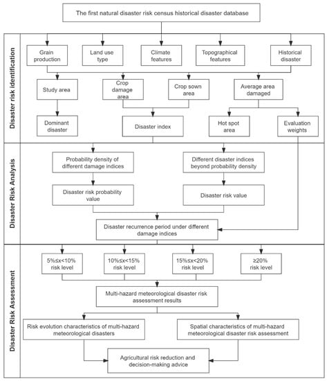 The difficult problem in disaster risk assessment is how to use incomplete information to derive the most accurate evaluation results possible. To this end, this paper proposes a multi-hazard meteorological disaster risk assessment method for agriculture based on historical disaster data, which mainly consists of three aspects: disaster risk identification, disaster risk analysis, and disaster risk assessment. Meanwhile, the authors made a preliminary attempt to conduct a multi-hazard meteorological disaster risk assessment for each major grain-producing area based on historical disaster data from the first national comprehensive natural disaster risk census of 18 major grain-producing areas in Jilin province. The results of the study provide a new idea for the application of historical disaster data at the small-scale area level in the later stage of the disaster risk census results and provide a basis for agricultural safety and disaster prevention and control in the main grain-producing areas. The main conclusions are as follows.