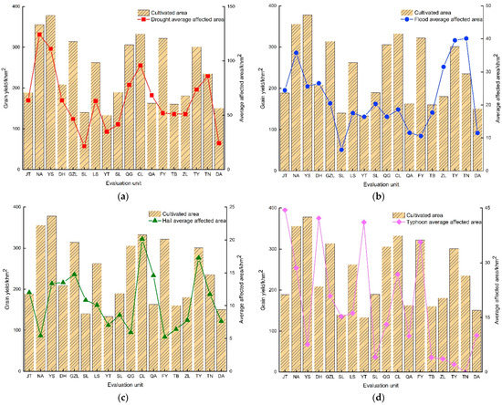 The drought disaster not only affected a large area of crops, but also affected a wide range; all the major food production areas have been affected by the drought disaster. Nongan and Yushu were seriously affected by the drought, with the average affected area exceeding 100 khm2 (Figure 4a). The average affected area caused by flood disasters has decreased compared with drought, and the average affected area of each main grain-producing area is below 40 khm2; however, the average affected area in Taonan, Tongyu, and Zhenlai is higher compared with other places, which has a certain correlation with the water system, such as Nen Jiang River or Jiao Liu River, in the region (Figure 4b). Typhoon disaster presents a certain regional correlation in the main grain-producing areas of the eastern regions of Jiutai, Nongan, Dehui, Yitong, and other places where the more obvious impact is the focus on regional prevention (Figure 4c). Hail disasters have the least impact on the main grain-producing areas, with an average affected area of 20 khm2; only Changling and Tongyu are relatively high and need to focus on prevention (Figure 4d). From a comprehensive point of view, among the four hazard disasters studied, drought disasters and flood disasters are the core disasters in the main grain-producing areas of Jilin province and need to be the focus of prevention methods. The average disaster losses of crops from hail and typhoon disasters are relatively lower, but regional hail and typhoon disasters occur frequently, and their resulting regional impacts cannot be ignored.