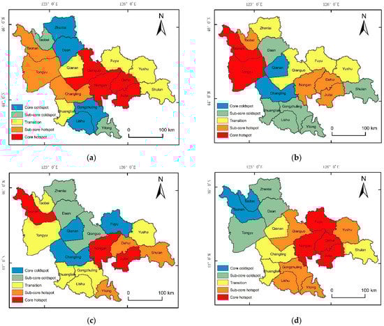 Based on the average disaster area of 18 major grain-producing areas, the local Getis-Ord Gi* index was used to study the degree of clustering of the spatial distribution of variables, which can respond well to the distribution of cold hotspots on the local spatial area of variables. The distribution of hotspot areas for each disaster was analyzed for 18 major grain-producing areas, and the degree of clustering was expressed according to the significance Z. The higher and greater that Z was than 0, the tighter the target object’s high-value clustering (forming a hotspot); the lower and greater that Z was than 0, the tighter the target object’s low-value clustering (forming a cold spot). The hotspot and cold spot are calculated by Formulas (16)–(18). In hotspot analysis, the natural intermittent point method was used to divide the cold hot spot area into five categories, namely, core hot spot area, sub-core hot spot area, transition area, sub-core cold spot area, and core cold spot area. The results show that the hotspot areas for drought hazards are widely distributed in the study area. Qianguo, Nongan, Dehui, and Jiutai are the core hotspot areas of drought disasters, and Taonan and Tongyu, in the western part of the study area, are the sub-core hotspot areas (Figure 5a). Flood disasters are similar to drought disasters, with Taonan and Tongyu as the core hotspot areas and Jiutai and other places in the eastern region as the sub-core hotspot areas (Figure 5b). This means drought and flood disasters are widely distributed and many hotspot areas are affected. Hail disasters present core hotspot areas and sub-core hotspot areas in the five eastern places of study, while Tao Nan is also a hotspot area (Figure 5c). In addition, the hotspot area of typhoon disasters is mainly concentrated in the eastern part of the study area (Figure 5d). This means the distribution of hail and typhoon disasters has a certain regional nature.