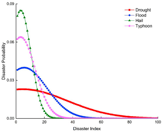The discrete domain is constructed according to the scope of disaster, the maximum value of the intensity of disaster, and the possible value of disaster; the discrete domain is constructed and the probability of disaster risk under different disaster indices in the main grain-producing areas is obtained according to Formulas (1)–(10). The probability density reflects the probability of the occurrence of major meteorological disasters under different disaster indices in the main grain-producing areas of Jilin province, so that the probability of the occurrence of different disaster levels can be inferred (Figure 6). The results show that the disaster indices of four meteorological disasters span the whole disaster index axis and all have the possibility of large area damage, among which the disaster areas of hail, typhoon, flood, and drought do not exceed 20%, 30%, 50%, and 80% of the total sown area, respectively. The density of exceedance probability can laterally reflect the level of risk of major meteorological disasters in Jilin agriculture under different disaster indices (Figure 7). The results show that the risk values of four major meteorological disasters decrease with the increase of disaster indices, and the disaster risk of each disaster in the main grain-producing areas under the same disaster indices is: drought > flood > typhoon > hail. From the frequency of disasters and the scope of disaster impact, drought disaster is the main natural disaster that harms Jilin province’s main natural disaster for grain production.
