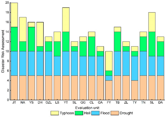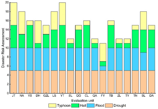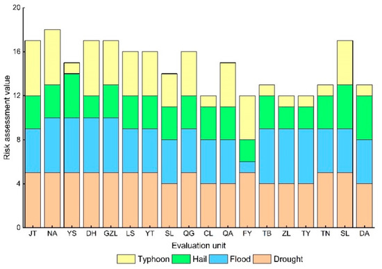 At a disaster index of 10% ≤ x < 15% (Figure 9), there was almost no change in the risk level of drought disaster and flood disaster in each major grain-producing area with a disaster index of 5% ≤ x < 10%. The risk level of hail hazards in each major grain-producing area was elevated, and only two areas (Shuangliao and Qianan) had no change in disaster risk level. Typhoon disaster risk is just the opposite of hail disaster risk. The risk level of most areas did not change, but the disaster risk level of Fuyu and Yitong increased to a high level.