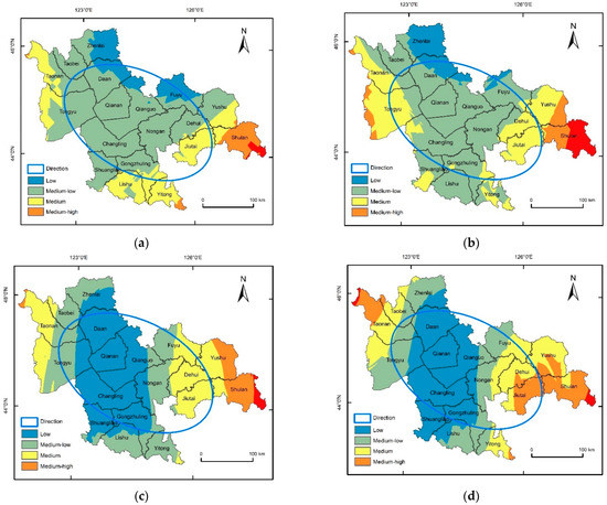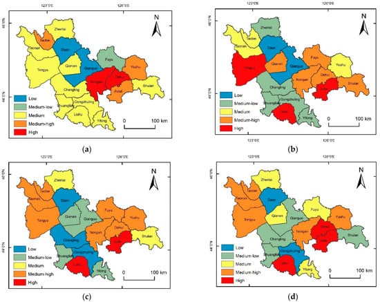 Specifically, when the disaster index is 5% ≤ x < 10% (Figure 13a), the multi-hazard rank trend in the central part of the study area shows medium–low risk, the multi-hazard rank trend in some districts and counties in the eastern part is high and medium–high risk, and this area is the key area for multi-hazard risk prevention. With the increase of the disaster index to 10% ≤ x < 15% (Figure 13b), the trend of agricultural multi-hazard meteorological disaster risk level develops from the east and west to the middle, and the low-risk area in the middle of the study area expands. Shulan and Yushu may have more than 10% of their crops affected by multiple hazards. When the damage index is 15% ≤ x < 20% (Figure 13c), the range of low- and medium–low-risk areas is further expanded, and the risk levels in the central part of the study area all show low risk levels, while only some areas in Taonan, Yushu, and Shulan are medium–high risk, and the area covered by low risk is the most extensive at this time. When the disaster index is x ≥ 20% (Figure 13d), the range of medium–high risk is further expanded, and the northeast of the study area and the western part of Taonan and other places present a medium–high-risk grade of agricultural multi-hazard meteorological disaster. Some areas in the northeastern direction suffer from the possibility of a multi-hazard meteorological disaster risk impact and a wide range of impact, which is the focus of regional agricultural prevention.