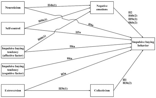 Second, the mediating roles of both collectivism and negative emotions are verified when testing the indirect effects. On the one hand, our findings revealed that extroversion can trigger impulsive buying behavior through its positive influence on collectivism. Extrovert consumers can quickly integrate themselves into a group and then be influenced by the group’s opinion, i.e., the extrovert personality can cultivate or activate collectivism, which makes extrovert consumers more prone to impulsive consumption behavior. On the other hand, we also observed that both neuroticism and the affective factor of impulsive buying tendency can promote impulsive buying behavior by positively affecting negative emotions, while self-control can result in impulsive buying behavior by negatively affecting negative emotions. Neuroticism is characterized by emotional instability [72], easily leading to negative emotions, which can then induce impulsive buying behavior. At the same time, the affective factor of impulsive buying tendency is easily influenced by the outside world, producing negative emotions, which can then directly cause impulsive buying behavior (e.g., [4,47]). In addition, when self-control is weakened, it is impossible to have good control over one’s own emotions, easily leading to negative emotions, which will then give rise to the impulsive buying behavior of consumers.