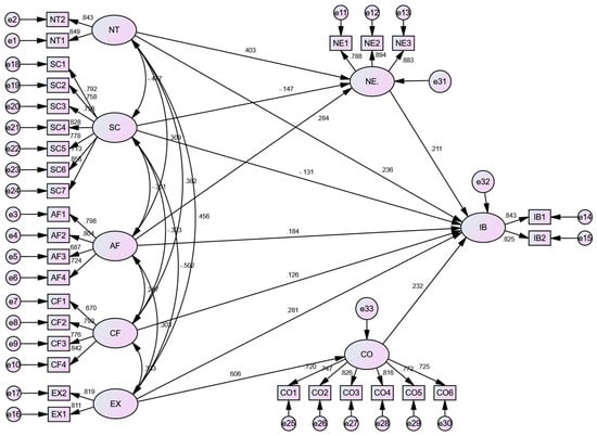To obtain stable results, we performed bootstrap 2000 times when calculating t values and path coefficients using AMOS 27.0. The results of the structural model test are presented in Figure 2 and Table 5. Both collectivism (β = 0.232, <0.001) and negative emotions (β = 0.211, <0.001) can directly cause impulsive buying behavior and their positive influences are significant. Thus, H1 and H2 have been verified. Extroversion (β = 0.281, <0.001) and neuroticism (β = 0.236, <0.001) of the big-five model can directly cause impulsive buying behavior, and these positive influences are significant, so H3a and H4a are verified. Self-control (β = −0.131, <0.01) can directly cause impulsive buying behavior and this negative influence is significant. Therefore, H5a has been verified. Both the cognitive factor (β = 0.126, <0.001) and affective factor (β = 0.184, <0.001) of impulsive buying tendency can directly cause impulsive buying behavior and their positive influences are significant. Consequently, H6a has been verified. In short, collectivism, negative emotions, extroversion, neuroticism and the cognitive and affective factors of impulsive buying tendency can directly cause impulsive buying behavior, and these positive influences are significant, while self-control can directly cause impulsive buying behavior and this negative influence is significant. In other words, H1, H2, H3a, H4a, H5a and H6a have been verified.