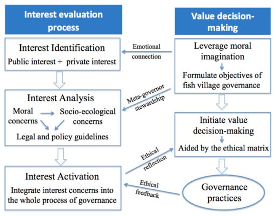 Once the infrastructure is built, good governance measures need to be activated to run through the whole implementation process. Fisheries and aquaculture constitute a production relationship based on aquatic resources, and a way of human life that cohabits and communicates with these resources. Maintenance of order of such production and life requires guidance of moral values, which would otherwise result in the alienation of both man and nature under capital and technological suppression [29]. Value-based decision-making advocates the consideration, evaluation and selection of various schemes to be implemented by fish townships and villages in a manner consistent with ethical factors. In the face of moral dilemmas, it is imperative to create a multi-stakeholder participatory mechanism steered by the government meta-governor, identify public and private interests, and balance long-term and short-term socio-ecological objectives [30]. By integrating interests into the community’s moral imagination and practices, villagers’ enthusiasm for cooperation is aroused for working out good choices. When making decisions, specific steps are expected: activate moral imagination among villagers, determine ethical governance goals (ethical matrix), implement value-based decision-making and carry out governance practices [31] under government stewardship.