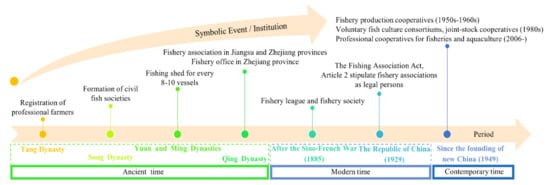 The study selects China’s participatory fisheries and aquaculture management as a case research object. The information used to describe its evolution comes from widely available resources, such as governmental websites and documents, historical records, peer-reviewed articles and grey literature. Chinese grassroots fish localities can be divided into inland and marine townships/villages geographically; into pure fishing or aquaculture, leisure, semi-fishing and semi-agricultural townships/villages based on production functions; and into fishing and aquaculture townships/villages considering major resource use patterns. Diversified communities providing their residents negotiation platforms tend to enjoy greater opportunities to address the allocation dilemma of competitive public resources. Since ancient times, Chinese fishermen (farmers) have performed fishing and aquaculture under a collective spirit. To protect group operation efficiency and individual rights and interests, various organizations have been gradually initiated. Guided and underpinned by relevant administration agencies, these institutions play an increasingly significant role in activating ethical behaviors and promoting social cohesion in fish localities for good governance. In this section, we outline the evolution of such participatory management as a foreground for analysis.