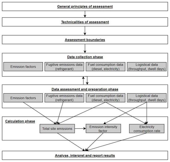 This research article uses the Fraunhofer Institute’s Guide for greenhouse gas emissions accounting at logistical sites [20] as the base methodology. Section 2 deals with the key methodological aspects of the study. These include the general principles of assessment, which are discussed in Section 2.1. Section 2.2 explains how the base methodology was adjusted and which assumptions were made in the study. In Section 2.3 the boundaries of assessment are defined, while Section 2.4 elaborates on the data collection phase. Finally, Section 2.5 discusses how the collected data were assessed and prepared for calculation. The calculation phase is discussed in Section 3 while the analysis, interpretation and reporting of results are presented in Section 4 and Section 5. Figure 1 provides a visual representation of the methodology used in the study.