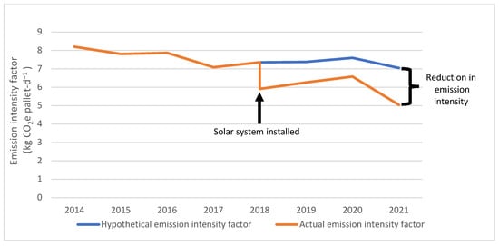 Using a combination of solar and grid electricity has a major impact on the emission intensity factor. From Figure 5, it is apparent that the actual emission intensity factor decreased by nearly 2 kg CO2e pallet-d−1 from 2018 onwards owing to the installation of solar systems. Solar systems are, therefore, a relevant decarbonization strategy for cold-store facilities. All facilities have the potential space and capability to expand their solar systems. The practicality of becoming completely self-sufficient with solar electricity is, however, debatable. Power generation only occurs during daytime, meaning that electricity has to be stored for night-time consumption. None of the analyzed facilities store electrical energy as batteries are extremely expensive and have a limited lifespan. In addition, the required battery capacity to store this amount of energy would be significant and impractical. Furthermore, due to reduced generation in winter months, the required capacity would need to be increased exponentially to remain self-sufficient, which would lead to overproduction during the summer months.