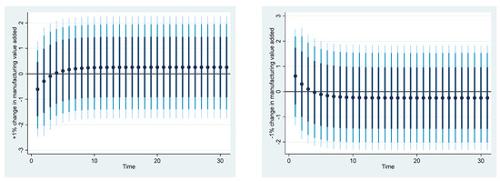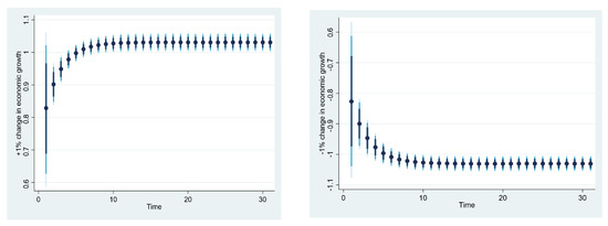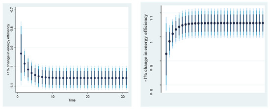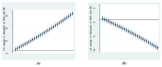 In addition, Figure 3 shows that a 1% increase in EE and a 1% decline in EE create substantial changes in India’s CO2 emissions in both the short and long run. In the long run, India can achieve a sustainable environment by promoting 1% EE. Although the Indian government has taken various steps to encourage EE, these efforts need to be sustained. This ensures environmental security and, in the long term, maintains a static state. However, a 1% increase or reduction in the interaction of MVA and EE and its influence on CO2 emissions produce intriguing graphs. In either situation, a 1% increase or reduction has a significant impact on environmental quality in both the short and long term. Figure 4a shows that a 1% improvement in both EE and industrial value added can simultaneously raise CO2 emissions in India in a linear fashion from short to long term. In contrast, Figure 4b illustrates that if the interaction of EE and MVA decreases by 1%, the quality of the environment improves with reducing CO2 emissions. As a result, officials should consider the best mix of manufacturing share and EE for long-term environmental quality to ensure that any additional share of the manufacturing sector does not lead to any additional threat to the environment.