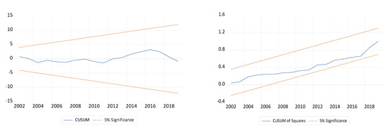 In this research, model stability was checked using several model diagnostic tests, such as cumulative sum (CUSUM) and square of CUSUM plots. The Breusch–Godfrey Lagrange Multiplier (LM) test was used to find serial correlations, whereas the Jarque–Bera test was used to check for normality. We assessed heteroskedasticity using the Breusch–Pagan–Godfrey tests. The Ramsey reset test was employed to determine whether the model was presented correctly. In addition, we used traditional ARDL, FMOLS, and Canonical Cointegrating Regression (CCR) models to verify the robustness of our dynamic ARDL estimations.