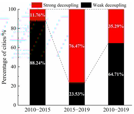 - Shan, Y.; Fang, S.; Cai, B.; Zhou, Y.; Li, D.; Feng, K.; Hubacek, K. Chinese Cities Exhibit Varying Degrees of Decoupling of Economic Growth and CO2 Emissions between 2005 and 2015. One Earth 2021, 4, 124–134. [Google Scholar] [CrossRef]