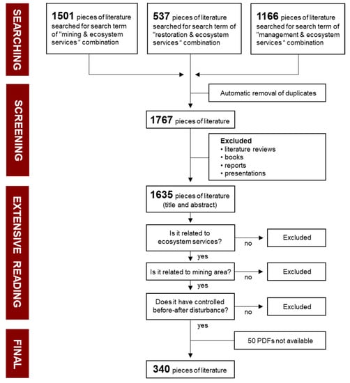 In this study, the Web of Science (WoS) was chosen for the analysis of human disturbance impacts on ESs, and the cutoff date for the inclusion of publications was 9 December 2020. Only one electronic database was selected to avoid double-counting scientific publications [52]. As ESs have been extensively studied, and the uses of the term are not standardized, there exist obvious differences in the expression of ESs in scientific publications of various countries [53,54]. By using relevant research [55], the final search used the combination of keywords shown in Table 1. A total of 3204 papers were screened; we screened the studies based on their titles and abstracts [42]. From this overall body of research, literature reviews, books, reports, and presentations (i.e., grey literature) were excluded to avoid repeated viewpoint records [52,55]. Beyond that, we excluded research without disturbances or full text. Studies that used explicit ES concepts or specific ES types were included. From the 3204 studies initially screened, 340 were selected for further analysis (Figure 2).