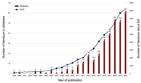 - McDonough, K.; Hutchinson, S.; Moore, T.; Hutchinson, J.M.S. Analysis of publication trends in ecosystem services research. Ecosyst. Serv. 2017, 25, 82–88. [Google Scholar] [CrossRef]