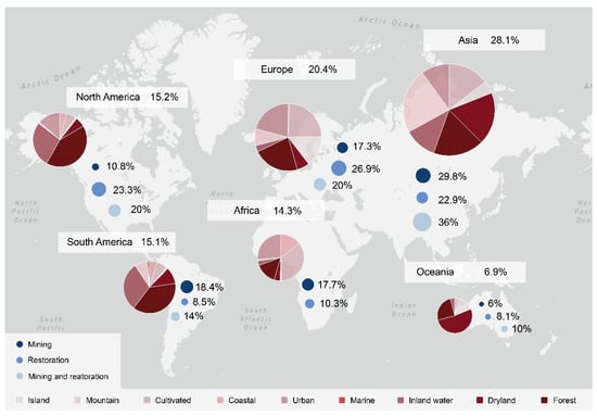 The number of journal articles focusing on ESs has increased substantially over the last decade [53]. Research on the effect of human disturbances on ESs in mining areas began in 1999 and has increased between 2010 and 2020 C.E. (before 2010, studies were sparse and irregular) in our database. The number of publications in 2020 increased 15.5 times in comparison to the 2010 level (Figure 3). Most studies were conducted in Asia (28.1%), Europe (20.4%), North America (15.2%), and South America (15.1%) (Figure 4). In mining areas worldwide, the majority of disturbances occur in forest ecosystems (26.1%), cultivated ecosystems (15.4%), and dryland ecosystems (13.9%). Overall, mining (62.9%) was the most common human disturbance in mining areas, followed by restoration (30.3%), with only 6.8% of the samples showing mixed effects. However, the negative (49.3%) and positive effects (41.6%) on ESs were nearly equally distributed. ESs affected by human disturbances involved all categories (i.e., regulating services (41.3%), cultural services (23%), provisioning services (22.4%), and supporting services (13.3%), which indicates that relatively little attention has been paid to cultural services [59] (Figure 5).