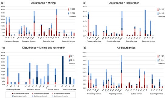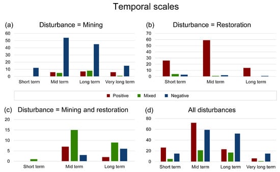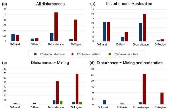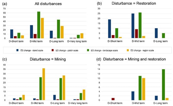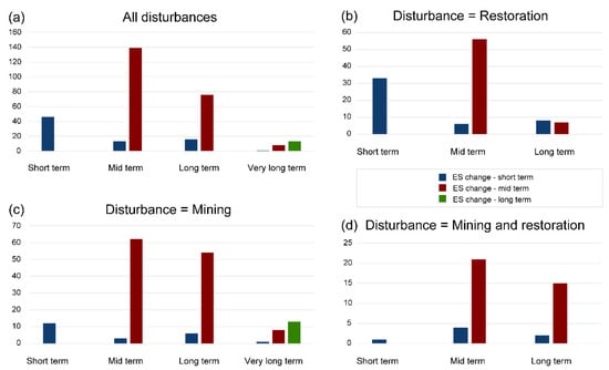 Temporal scales of disturbances and ES changes. The distribution of disturbances (i.e., mining, restoration, mining and restoration, all disturbances) and ES changes at temporal scale. (a) all disturbances, (b) disturbance = restoration, (c) disturbance = mining, (d) disturbance = mining and restoration.