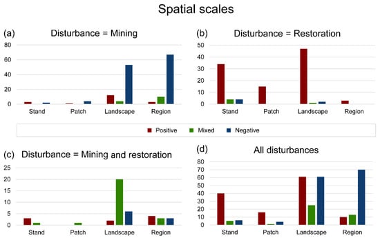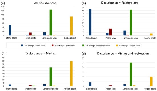 Spatial scales of disturbances and ES changes. The distribution of disturbances (i.e., mining, restoration, mining and restoration, all disturbances) and ES changes at spatial scale. (a) all disturbances, (b) disturbance = restoration, (c) disturbance = mining, (d) disturbance = mining and restoration.