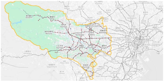 In the current research, we mainly selected the rail lines in the suburbs of Tokyo for analysis (Figure 1). Most of the rail transit lines laid in the suburbs of Tokyo are of the above-ground style or the elevated style. They meet the requirements of this study, and the above-ground style is preferred in our study. For the relevant rail lines, refer to Table 2.