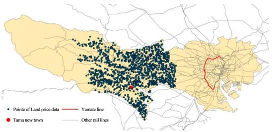 This study collects and calculates the data related to noise and station accessibility and lists other influencing factors as much as possible. Limited by the difficulty of data acquisition and based on the existing research described above and the availability of data, we initially adopted the characteristic variables as shown in Table 4. Among them, the 2019 land price data, building density, plot ratio, walking distance from the rail station, passenger flow at the station, geographical coordinates, etc. of the suburb areas of Tokyo are obtained from the official website of Japan’s Ministry of Land, Infrastructure, Transport and Tourism (Figure 2). By importing the above data into the ArcGIS platform and unifying the coordinate system, we can further calculate the distance from the central urban area, the distance from the track line, the distance from the primary school, the distance from the junior middle school, the commerce-supporting facilities and other data. These data will be further screened in each specific part of the study.