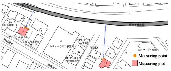From the initial development stage of private railways, Japan carried out an integrated construction initiative between the state and cities, and thereby achieved public transit-oriented development (TOD). This included the construction of junction stations with composite functions, the integrated station–city development of rail transit stations around residence communities, and the simultaneous development of the areas along the rail line []. In regard to rail transit noise, Japan raised different acoustic environment requirements for lands used for different functions but did not formulate a policy to push back the buildings along the rail transit line. Table 1 shows the many residential lands or the lands with residential functions that are arranged along the rail transit line or around its station sites. These comprised the research objects in this paper.