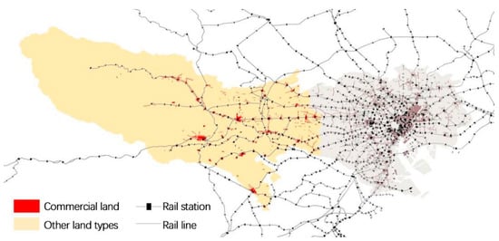Distribution of commercial land parcels and rail transit stations in the suburbs.