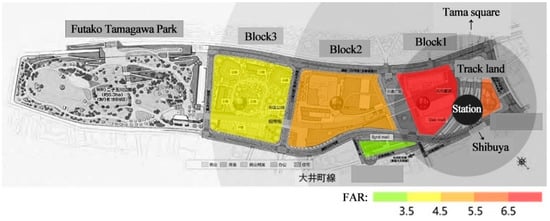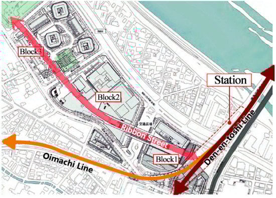 Basically, the re-development range is in the core area 500 m away from the station (Figure 9), and its main contents include: Block 1, comprising a station, its neighboring three shopping malls, and an office building; Block 2, comprising a super high-rise office building and one high-rise hotel; and Block 3, comprising three high-rise apartments. Futakotamagawa Park was built outside Block 3. Moreover, an overpass called a “ribbon street” goes across the inside of the land parcel, connecting three blocks and the park (Figure 9).