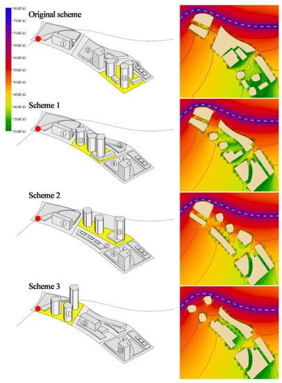 Different schemes and noise simulation. “●” means the location of station; ①,②,③,④ means the serial number of blocks in schemes; Yellow indicates residential plots, while others are commercial office plots.