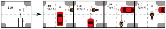 Example of the extension process applied to DCA scenario n°110 (left). It was divided into four different crash scenarios (right) using the variable “Type”, which specifies all possible crash combinations, i.e., if vehicle 1 and 2 are PTWs or other vehicles and all the possible combination of crashes between them.