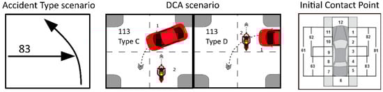 CRSS codes crash configurations based on an Accident Type classification scheme (Appendix A Figure A3), which contains 64 crash configurations divided by typology [11]. The main difference between the Accident Type and the DCA tables is that CRSS’ Accident Type table is based largely on the type of impact, while the DCA table is mainly based on the intentions and maneuvers of the riders. To make comparison with the other datasets possible, the Accident Type configuration chart used in CRSS was translated to the Italian DCA configuration chart, as they both use right-hand driving. To better specify the correspondence, additional CRSS variables [11] describing riders’ intentions and maneuvers were included as needed (Appendix A Table A2 shows the correspondence between the charts). Figure 2 shows an example of the translation between Accident Type scenario n°83 and DCA n°113, as well as the CRSS variable “Initial Contact Point”, which was used to make a distinction between DCA n°113 type C or D.