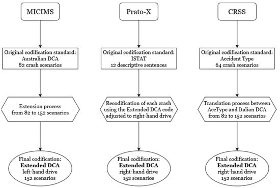 Different re-coding methods used for the three datasets. MICIMS crashes, originally catalogued into 82 scenarios, were re-coded into 152 scenarios. Prato-X and CRSS, using different procedures, were both re-coded using the extended DCA adjusted for right-hand driving (Italian DCA).