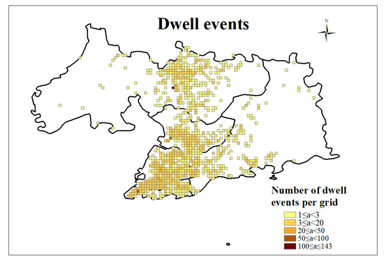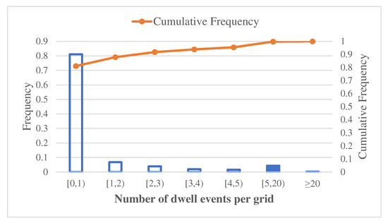 Frequency distribution of the number of dwell events per grid.
