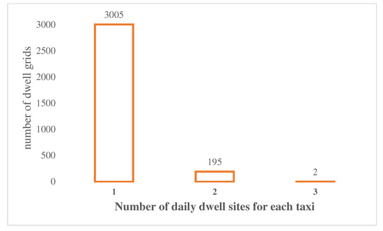 Figure 3 shows the number of dwell sites at which one driver would dwell in a day. Most taxis only have one dwell event in a day, and a taxi can stay in up to three locations for more than 20 min in a day. Figure 4 shows the spatial distribution of dwell events ( represents the number of dwell events per grid). As seen in Figure 4, the grids with dwell events are relatively dense, and the grids with many dwell events are mostly located in the center of each district. The eastern part of Laoshan District is Laoshan Scenic Area, and the electric vehicle dwells are relatively few and scattered, so there are fewer grids with dwell events; the development of the eastern and western parts of Chengyang District is more different, and the western area is relatively backward and has fewer electric vehicles, so the grid distribution in Figure 4 is consistent with the actual situation of EV dwells in the city.