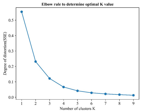 This paper uses the elbow rule to determine the number of clusters . In the elbow rule, the sum of squared errors (SSE) of the distance between the cluster center of each class and the sample points in the class is called the degree of distortion. For a class, the lower the degree of distortion, the closer the sample points within the class are. The more the number of clusters, the fewer sample points each class contains, and the closer the sample points are to the center point of the cluster, so the degree of distortion will decrease with the increase of the number of clusters. If the number of clusters exceeds the actual number of categories, the degree of distortion changes little, even if the number of clusters increases, the degree of distortion does not change significantly, so an area similar to “elbow” will be formed on the line graph composed of the degree of distortion and the corresponding value of the elbow is the selected number of clusters. The formula for calculating the degree of distortion (SSE) can be written by Equation (5)
