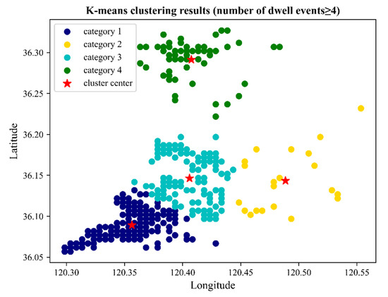 Figure 6 shows the clustering diagram of K-means clustering with selected . The dots of different colors represent different clustering categories. The geographical locations between the grids within each category are the closest, and the number of grids in the 4 categories are 118 (category 1), 21 (category 2), 102 (category 3), and 54 (category 4), respectively. From Figure 6, we can see that the sample points in category 1, category 3 and category 4 are more concentrated, while the sample points in category 2 are more dispersed. The grids in category 2, belonging to the Laoshan District, are unevenly distributed because there is a large mountainous area in Laoshan District.