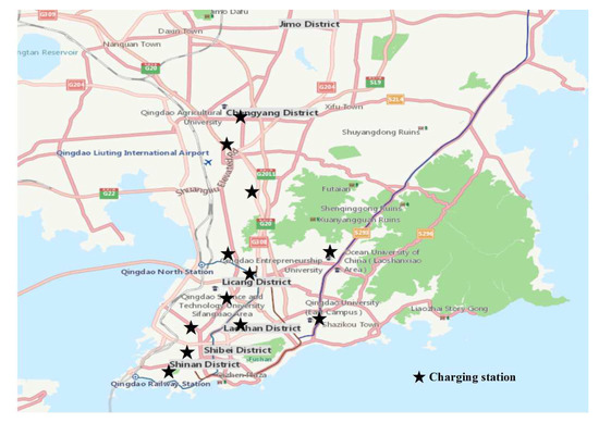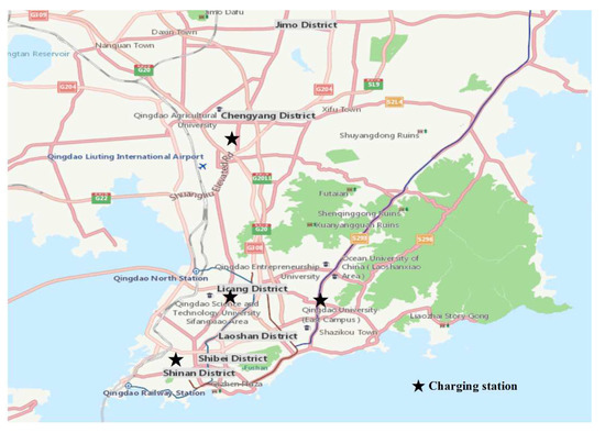 Figure 7 shows the best locations of charging stations obtained by the multiple same-type clustering algorithms. As can be seen from Figure 7, charging stations are located in the economic and residential centers of Shibei District, Licang District, Laoshan District, and Chengyang District, respectively. However, the small number of charging stations may cause long queues of electric taxis and reduce drivers’ satisfaction with charging, while the long queues may cause traffic congestion problems around the charging stations. Therefore, it is necessary to further deal with.