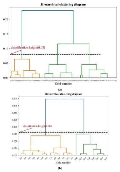 Based on the results of K-means clustering, a two-step clustering method (agglomerative hierarchical clustering and K-means weighted clustering) is used to optimize the location of charging stations. Firstly, agglomerative hierarchical clustering is performed on the sample grid data of each class obtained by K-means clustering, and a relative distance of 0.08 is selected to classify the grid. Figure 8 shows the tree diagram obtained by agglomerative hierarchical clustering for each of the 4 classes of sample grid data. The black dotted line in the tree diagram represents the relative height of 0.08, which is used to divide the results of agglomerative hierarchical clustering.