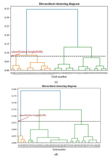 Tree diagram of hierarchical clustering algorithm. (a) Hierarchical clustering diagram for category 1. (b) Hierarchical clustering diagram for category 2. (c) Hierarchical clustering diagram for category 3. (d) Hierarchical clustering diagram for category 4.