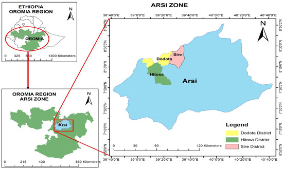 The study was conducted in the Arsi zone in Ethiopia’s Oromia regional state during the 2018 cropping season. The region is known as one of the major wheat-producing areas in the country. Three districts (Sire, Dodota, and Hetosa) were purposively selected for this study (Figure 1 and Table 1). The two districts, Sire and Hetosa, were among the top wheat-producing areas [16]. Dodota and Sire districts (previously known as Dodota Sire district) were among the most drought-affected districts, where up to 95% of farmers harvest was lost due to prolonged drought conditions [17], whereas Hetosa district is among the highest potential areas of wheat production where agriculture is relatively well-mechanized, and infrastructure for input access relatively exists. However, this district is also partially characterized by moisture stressed areas, according to the Bureau of Agriculture and Natural Resources (BOANR) staff of the district and personal observations.