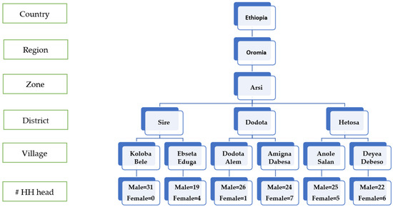 The study used a multistage random sampling method (Figure 2). At the first stage of sampling, the major wheat producing region, zone, and three districts from this zone were selected based on primary data collected from the Ethiopian Central Statistical Agency and using secondary data as described in the Section 2.1. Secondly, two villages (locally referred to as “Kebeles”) from each district were selected, making a total of six villages for the study. Villages accessible to the main roads and that produce wheat under dryland system were selected. At the third stage of sampling, 23–31 households from each village were randomly selected, resulting in a total of 170 household respondents out of which 13.5% were female-headed households (Figure 2).