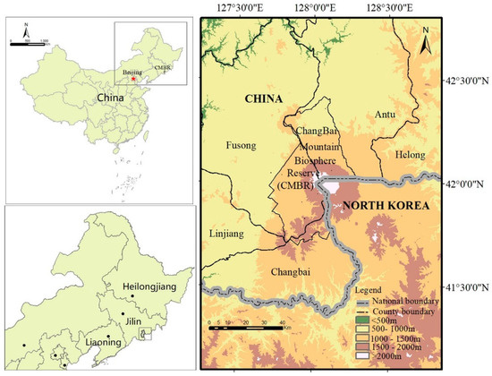 Located in Jilin Province of northeastern China [41°41′49″–42°25′18″ N, 127°42′55″–128°16′48″ E] and situated on the China-North Korea border, the Changbai Mountain Biosphere Reserve (CMBR) occupies an area of 196,456 ha (Figure 1). The climate of the Reserve is continental temperate with obvious altitudinal variation between elevations ranging from 720 to 2691 m above sea level. The region is featured with temporary warm summers, and long cold winters. The annual precipitation is between 700 and 1400 mm, most of which occurs from June to September [66,67]. A wide range of topography, weather, soil, and other natural factors conduce abundant biodiversity and vertical vegetational landscapes ranging from temperate to arctic biomes [68]. As such, the CMBR is recognized as a rare gene bank of endemic species, with research showing that 2277 species of plants and 1225 known animal species are found in the reserve [67]. The CMBR has witnessed a long history of development and has gained a large reputation. It was established in 1960 with approval of the Government of Jilin Province, later allowed to join in the International Man and Biosphere Reserve Network of UNESCO in 1980, identified as a national forest wild animal nature reserve by the State Council in 1986, designated as an international A-level nature reserve by the International Union for Conservation of Nature (IUCN) in 1992, rated as one of the first national 4A-grade tourism areas by the China National Tourism Administration (CNTA) in 2001, and admitted as the first national 5A-level tourism scenic area in 2007 [67,69].