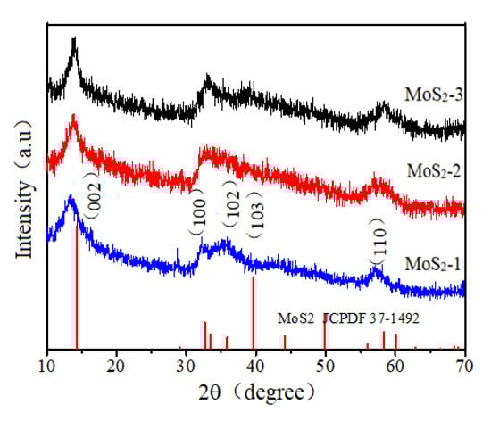 MoS2 nano materials were prepared by one-step hydrothermal method using the hydrothermal process of excess thiourea [21]. We dissolved 0.353 g ammonium molybdate tetrahydrate and 1.830 g thiourea (molar S/Mo = 12.0) in 15 mL distilled water. After stirring for 30 min, we transferred the solution to a stainless steel autoclave lined with polytetrafluoroethylene. Next, we set the heating temperature to 240 °C. In order to consider the influence of different reaction time on the experiment, we set the heating time to 1 h, 3 h, and 6 h, respectively. After natural cooling to room temperature, it was washed by centrifugation for several times. Finally, it was dried in a vacuum drying oven at 50 °C for 12 h, and then, the solid was collected. Solid substances produced with heating times of 1.3 and 6 h are named, respectively, after MoS2-1, MoS2-2, and MoS2-3.