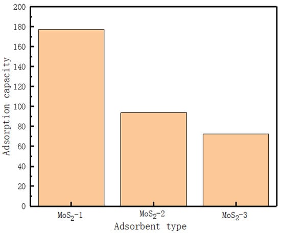 We added 20 mg of MoS2-1, MoS2-2, and MoS2-3 to 20 mg/L and 200 mL of MB solution. After adsorption equilibrium, we took a certain amount of supernatant, measured its absorbance with UV–Vis, and analyzed it. Figure 4 shows the effect of different heating times on the adsorption performance of MoS2 adsorbent. The experimental results show that MoS2-1 has the maximum adsorption capacity, indicating that MoS2 adsorbent with reaction time of 1 h has high adsorption capacity for MB dye. By comparison of MB before and after MoS2-1 adsorption, shown in Figure 5, it is clear that MoS2 is a good adsorbent for MB.