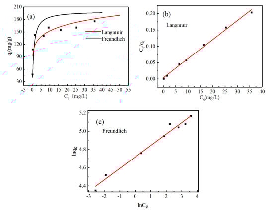 (a) The isotherm of adsorbed MB; (b) and (c) are the linear fitting curves of Langmuir model and Freundlich model for the adsorption of MB solution by MoS2 adsorbent, respectively.