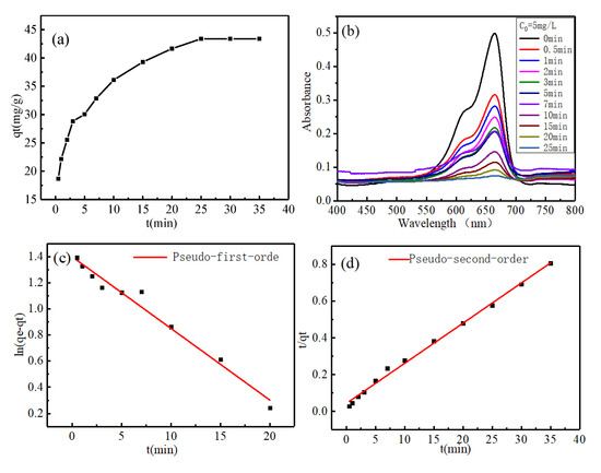 (a) The adsorption capacity of MoS2 to MB solution in different time periods; (b) UV absorption spectrum of MB solution concentration change; (c) and (d) linear fitting diagrams of pseudo first-order and second-order kinetic equations, respectively.